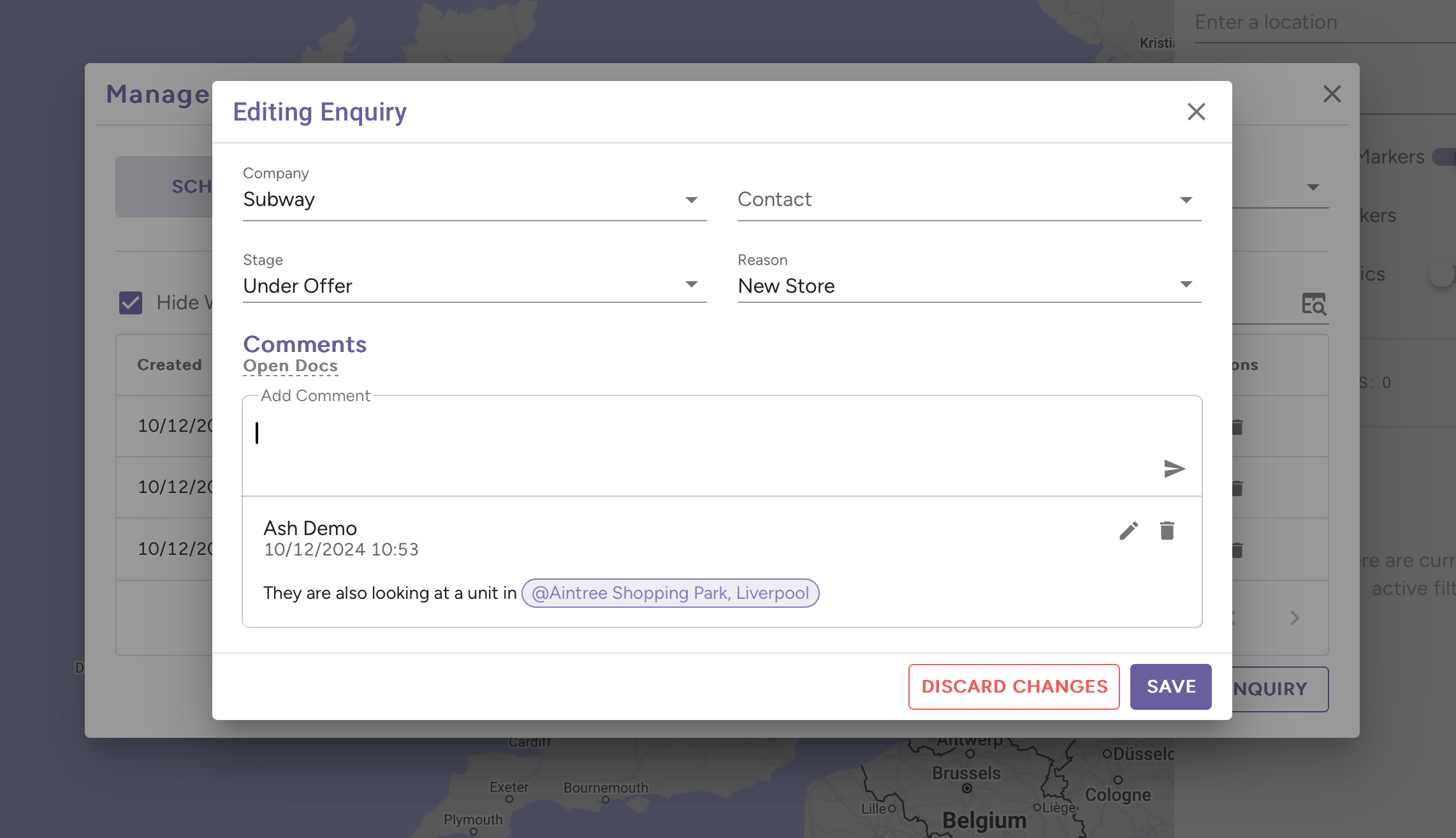 - When writing comments, you can tag in other entities to build up your companies knowledge base further. When you tag another entity, the enquiry and comment will show up when viewing the other entity providing extra insight.