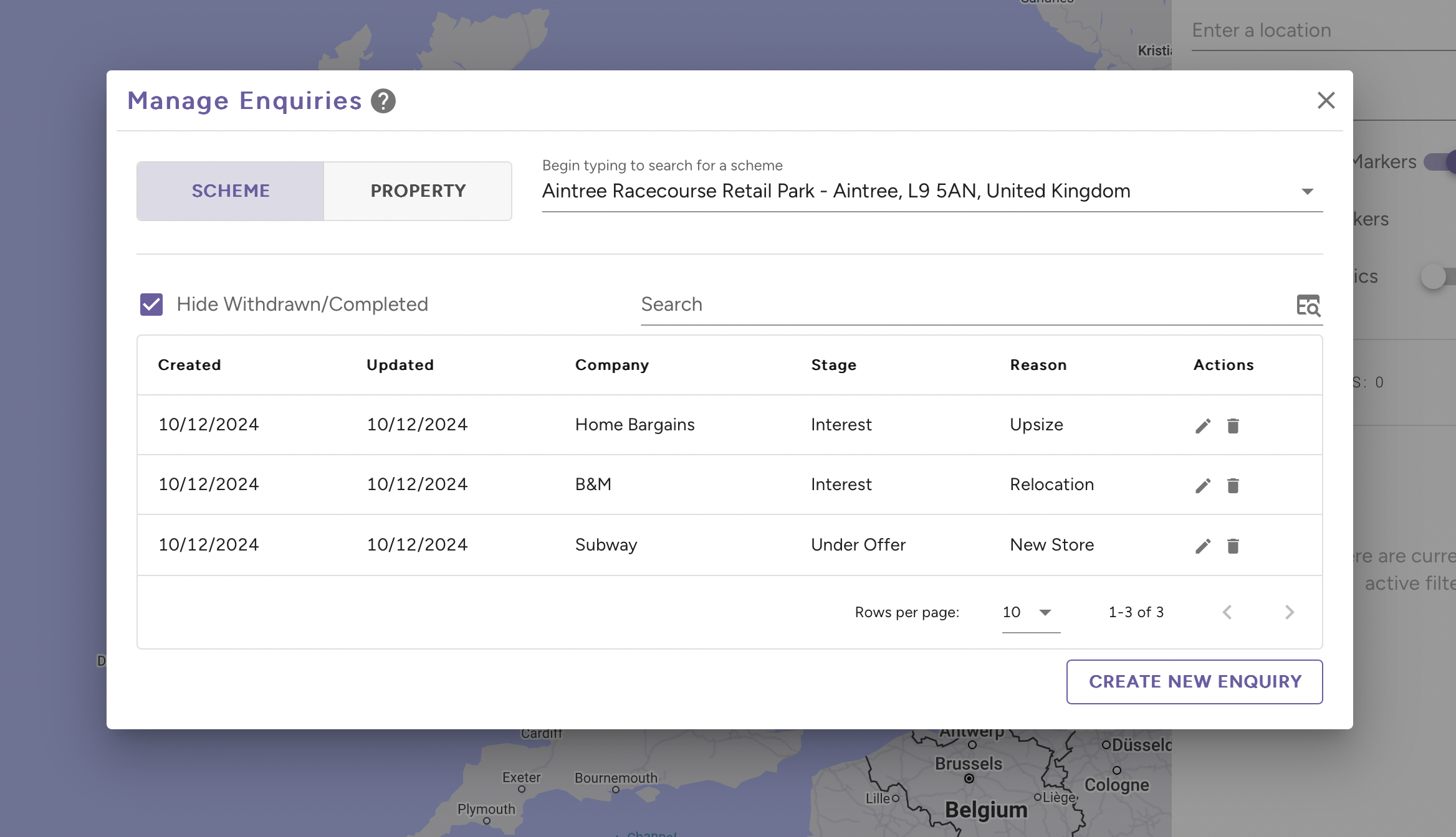 - Enquires have many statuses such as 'Interest', 'Under Offer', 'Withdrawn' and 'Completed'. You can view all of your enquiries on a dedicated page, which will show you enquiries by company or by property.